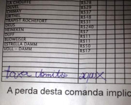 “Meu namorado passou mal pelo que tinha comido no almoço, acabou vomitando no Blue Pub e cobraram a ′taxa vômito′. Caiu no meu conceito”, dizia a namorada.
