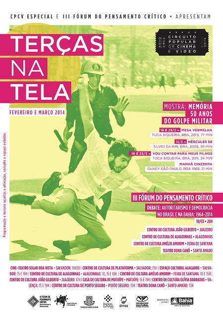O projeto Terças na Tela do Circuito Popular de Cinema e Vídeo está de volta aos Espaços Culturais SEcultBA e traz uma mostra especial numa ação vinculada à primeira edição do Fórum do Pensamento Crítico, em 2014 – Autoritarismo e Democracia no Brasil e na Bahia (1964 – 2014). “A mostra 50 Anos do Golpe Militar começa no próximo dia 18 de fevereiro e segue até 25 de março, sempre às terças-feiras, com os filmes “Vou Contar para Meus Filhos”, “Manhã Cinzenta”, “Mesa Vermelha” e “Hércules 56”.