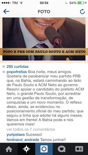 O deputado federal Acelino Popó (PRB), usou o seu perfil no Instagram para comunicar a decisão do PRB em apoiar o candidato da oposição Paulo Souto (DEM).