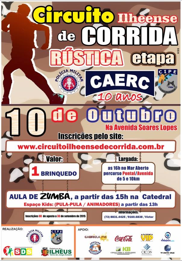 A Prefeitura de Ilhéus, por meio da Secretaria de Desenvolvimento Social (SDS) e em parceria com a Polícia Militar, realiza, no próximo dia 10 de outubro, a 3ª etapa do Circuito Ilheense de Corrida Rústica. Com saída do bairro Pontal, na zona sul, a competição homenageia os dez anos da Companhia de Ações Especiais da Região Cacaueira (Caerc-PM).