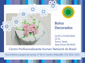 De 21 a 31 de março, o Centro Profissionalizante Human Network do Brasil realizará em Ilhéus o curso de Preparo de Bolos Decorados, com 32 horas, no período da tarde. Interessados devem se dirigir à Rua Antônio Lavigne de Lemos, 92, Centro e realizar sua inscrição para garantir a vaga. ...Governador da Bahia vai à China destravar obras estruturantes para o Estado