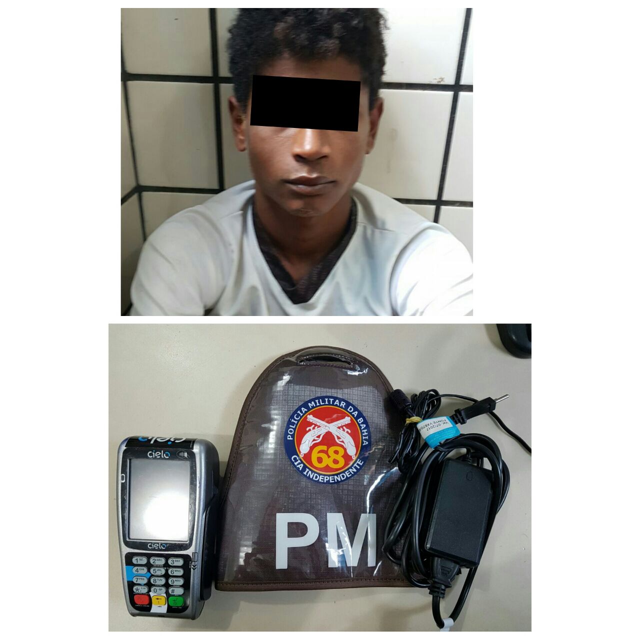 Na busca pessoal constatou tratar-se de um menor infrator e de Mateus Santos Luz de 20 anos. Em posse deste havia uma máquina de cartão de crédito, a qual foi identificada como produto de furto e que já havia uma queixa na Delegacia de Polícia (DP) em decorrência de tal fato.