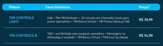 O novo portfólio está ainda mais atrativo e vantajoso para os clientes. No TIM Controle Light, o consumidor terá 2GB de internet (pacote anterior era de 1,5GB), ligações de TIM para TIM ilimitadas e 25 minutos em chamadas locais para outras operadoras por R$ 39,99 mensais. Já no TIM Controle B, por R$ 54,99 mensais estão disponíveis 3GB de dados (antes eram 2GB) e ligações ilimitadas para qualquer operadora do Brasil (usando o DDD 41) – um benefício até então inédito no segmento controle, além de WhatsApp à vontade para enviar e receber mensagens de texto, vídeos, imagens e fotos sem descontar da franquia de internet.