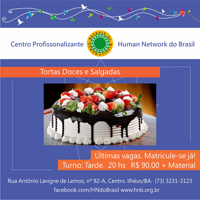 hnbtortasEsta é a sua última chance para se inscrever no curso de Tortas Doces e Salgadas em 2017, do Centro Profissionalizante Human Network do Brasil. As inscrições ainda estão abertas para o preenchimento das últimas vagas. Não perca essa oportunidade e faça logo a sua matrícula. Encerrar o ano de 2017 e começar o ano de 2018 com a mão na massa fazendo deliciosas tortas doces e salgadas, com recheios de dar água na boca, é começar a escrever uma nova história e com o pé direito.