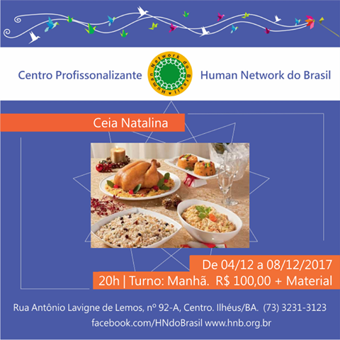 Aprenda a fazer uma ceia Natalina ma-ra-vi-lho-sa | Estão abertas as inscrições para o curso de Ceias Natalinas no Centro Profissionalizante Human Network do Brasil, Ilhéus. De 4 a 8 de dezembro, aprenda a fazer uma ceia natalina maravilhosa com tudo o que tem direito. São 40 horas de curso, com oferecimento de turma no período da manhã, das 8h às 12h.