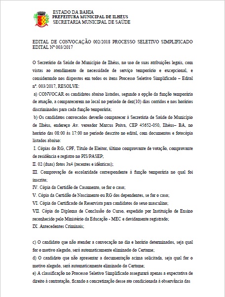 Fachada Secretaria de Saúde - DivulgaçãoA secretaria de Saúde do Município de Ilhéus está convocando os profissionais classificados no processo seletivo simplificado, conforme o Edital nº 003/2017, a se apresentarem, no período de 10 dias, a partir de hoje, 15 de janeiro, para o exercício da função temporária de atuação, munidos dos documentos contidos no Edital de Convocação nº 002/2017.