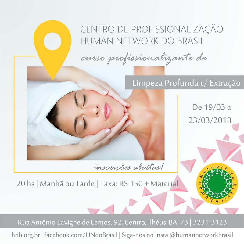Acontece de 19 a 23 de março, próxima semana, o curso de Limpeza de Pele Profunda com Extração, no Centro Profissionalizante Human Network do Brasil, em Ilhéus. As inscrições estão abertas, com opções de turmas no turno da manhã ou da tarde.
