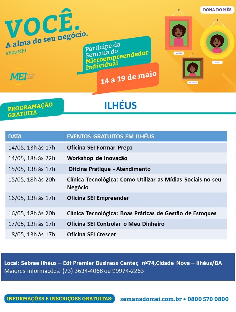 O Sebrae promove, de 14 a 19 de maio, a 9ª edição da Semana do MEI. Em Ilhéus, durante o período, a secretaria municipal de Indústria e Comércio (Sedic) vai promover a Sala do Empreendedor Itinerante. Técnicos da Sedic vão estar disponíveis em pontos comerciais estratégicos da cidade, esclarecendo dúvidas sobre a temática do empreendedorismo, promovendo novas formalizações e auxiliando os Microempreendedores de Ilhéus na Declaração Anual do Simples Nacional, que é obrigatória, e necessita ser feita até o dia 31 de maio em todo o território nacional.