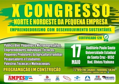 Informamos ainda que se faz  necessário a realização de eventos assim, surgindo da iniciativa privada buscando apoio do poder público para que possamos fomentar e disseminar o aumento do conhecimento dos nossos novos e atuais Empreendedores e assim sendo construir um ambiente favorável ao desenvolvimento. O X CONGRESSO NORTE NORDESTE DA PEQUENA EMPRESA- EMPREENDEDORISMO COM DESENVOLVIMENTO SUSTENTÁVEL, é uma realização da AMPESBA e conta com o apoio das entidades do segmento empresarial de Ilhéus e Itabuna, da UESC, Junior da UESC.