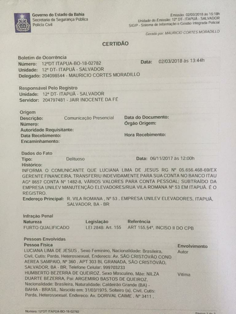 Do Blog do Gusmão Humberto Bezerra de Queiroz, procurador da empresa Unilev Tecnologia de Elevadores LTDA, localizada em Salvador, acusa Luciana Lima de Jesus de apropriação indébita. Luciana é supervisora de compras e serviços da secretaria de administração de Ilhéus e, segundo fontes da prefeitura, foi indicada para o cargo ...Curso gratuito de qualificação profissional em Ilhéus