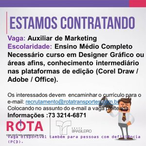 A empresa Rota Transportes, que integra o Grupo Brasileiro e atua no serviço de transporte rodoviário e semiurbano de passageiros na Bahia e em outros estados, está realizando recrutamento para a função de Auxiliar de Marketing. A base das atividades é a sede da Rota, em Itabuna.