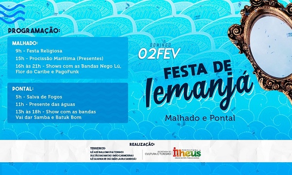 Consolidada no calendário turístico e cultural de Ilhéus, a Festa de Iemanjá em 2020 vem recheada de manifestações culturais, homenagem, mensagens de paz e consciência ambiental. Com o apoio da Prefeitura de Ilhéus, por meio da Secretaria da Cultura e do Turismo (Secult), o evento acontecerá no dia 2 de fevereiro (domingo), nos bairros Pontal e Malhado, e contará, além das festas religiosas, com shows das bandas Flor do Caribe, Nego Lú e Pagofunk, no Malhado, e as bandas Vai dar Samba e Batuke Bom, no Pontal. A festa conta com a realização dos terreiros de candomblé Ilê Axé Ballomi, de Pai Toninho; Sultão das Matas, de Mãe Carmosinha e Ilê Guainia de Oiá, de Mãe Laura Sandoiá.