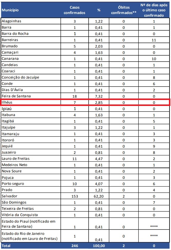 Bahia tem 246 casos confirmados de Covid-19; Ilhéus tem 7 casos confirmados