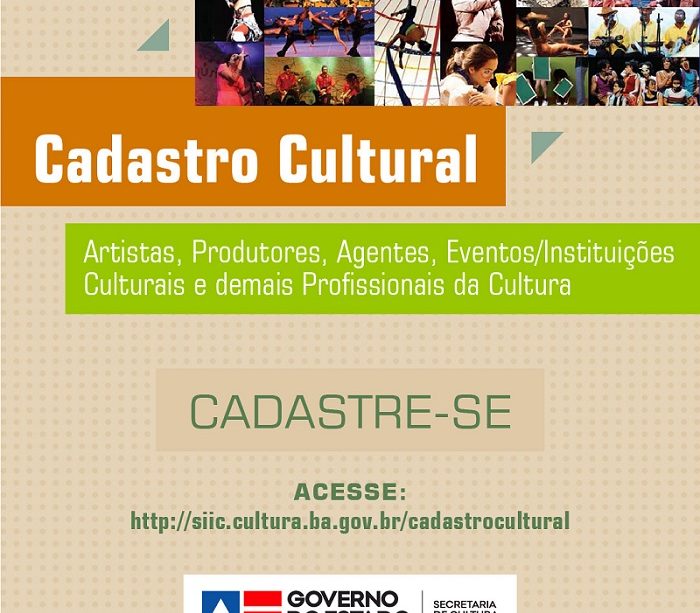 A Secretaria de Cultura do Estado da Bahia (SecultBA) convoca a partir desta quinta-feira (28) para inclusão e atualização do Cadastro Cultural no Sistema de Informações e Indicadores em Cultura, disponível em: siic.cultura.ba.gov.br/cadastrocultural. O intuito da iniciativa é traçar um panorama dos agentes, espaços, grupos e instituições culturais dos 27 territórios de identidade baianos.