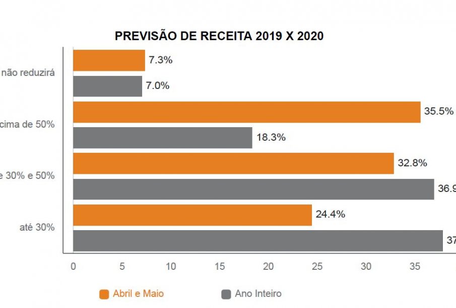 Uma pequena parte das empresas se mantém otimista e não projeta redução (6,4%) ou prevê aumento de receita (0,9%). Na visão completa sobre o ano de 2020 em comparação com o ano anterior, 93% das empresas acreditam em queda de faturamento, com 18,3% avaliando que haverá queda acima de 50%, mais de um terço (36,9%) projetando queda entre 30% e 50% e outra parte similar (37,8%) acreditando que esta queda será de até 30%. Uma pequena parte das empresas acredita que não terá queda (4,4%) ou que terá aumento de receita (2,6%).