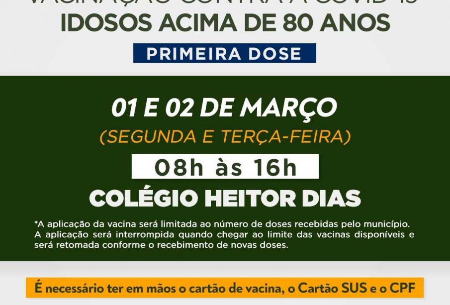 A Secretaria de Saúde (Sesau) da Prefeitura de Ilhéus informa que está realizando um nova chamada para idosos com mais de 80 anos receberem a primeira dose da vacina contra a Covid-19. As pessoas que integram o grupo começaram a ser vacinadas hoje (1º) e nesta terça-feira, 2 de março, na Escola Municipal Heitor Dias, das 8h às 16h.