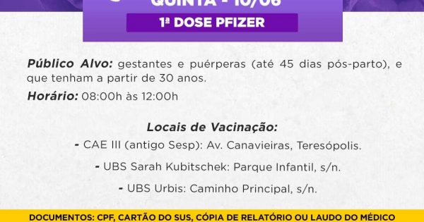 A secretaria municipal de saúde da Prefeitura de Ilhéus vai iniciar nesta quinta-feira, 10, a vacinação contra a Covid-19 para as gestantes e puérperas (até 45 dias pós-parto) a partir de 30 anos, com a aplicação da primeira dose da vacina da Pfizer. A oferta do serviço estará sendo realizada ...Vagas do SineBahia de Ilhéus para quinta-feira (10)