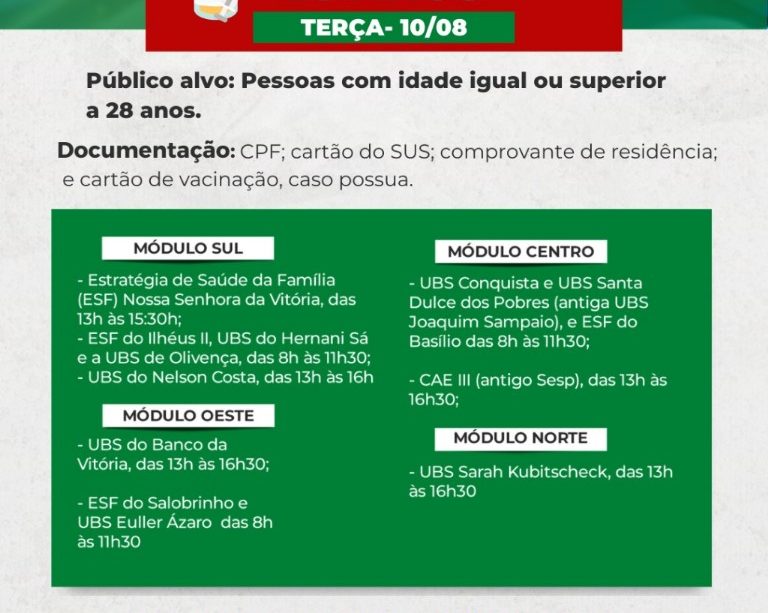 – ESF do Ilhéus II, UBS do Hernani Sá e UBS de Olivença, das 8h às 11h30;