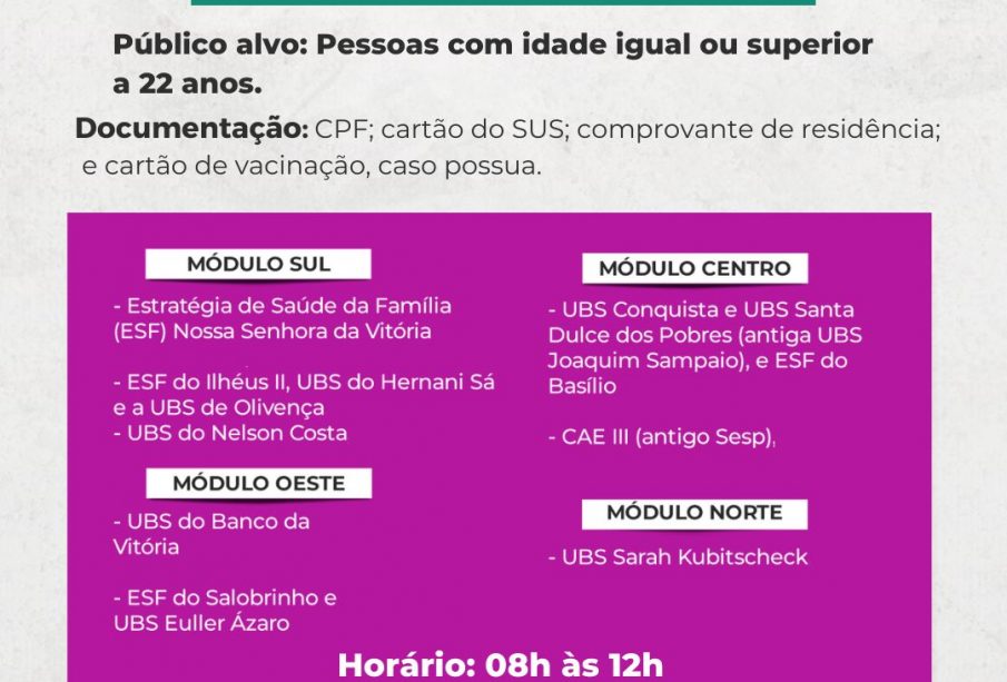 Pessoas com idade igual ou superior a 22 anos receberão a primeira dose contra a Covid-19 neste sábado (14) em Ilhéus. Conforme a Secretaria Municipal de Saúde (Sesau), a estratégia acontece nas 13 unidades de saúde previamente informadas, impreterivelmente das 8h às 12h. O público deve apresentar CPF, cartão do SUS, comprovante de residência e cartão de vacinação, caso possua.