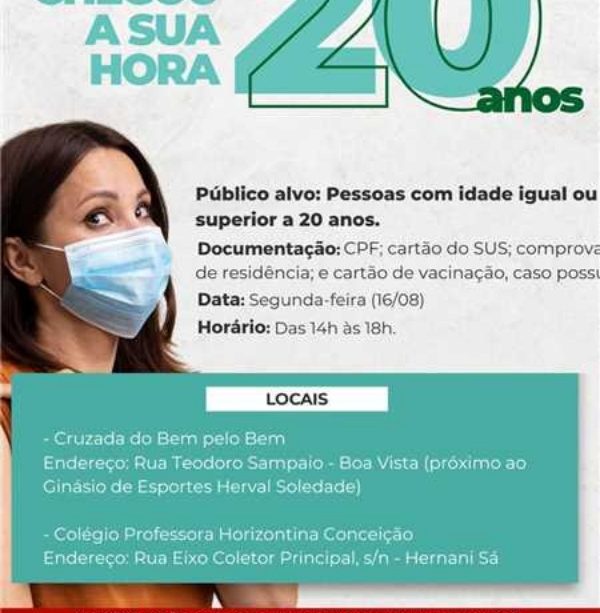 Os jovens com idade igual ou superior a 20 anos podem preparar o braço para receber a primeira dose da vacina contra a Covid-19. A Secretaria Municipal de Saúde (Sesau) informa que a imunização acontece nesta segunda-feira (16), na Cruzada do Bem pelo Bem e no Colégio Professora Horizontina Conceição, no Hernani Sá, das 14h às 18h ou enquanto durar o estoque de vacina.