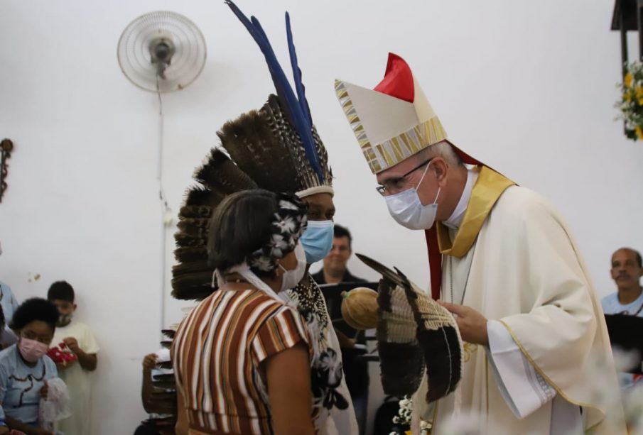 Na ocasião, lideranças indígenas presentearam o religioso com um cocar e um maracá. Presente na cerimônia, o vereador Cláudio Magalhães ressaltou que os tupinambás pediram ao bispo o retorno das pastorais Indígena e da Criança, atividades da igreja que ajudaram no combate à desnutrição de crianças da etnia.
