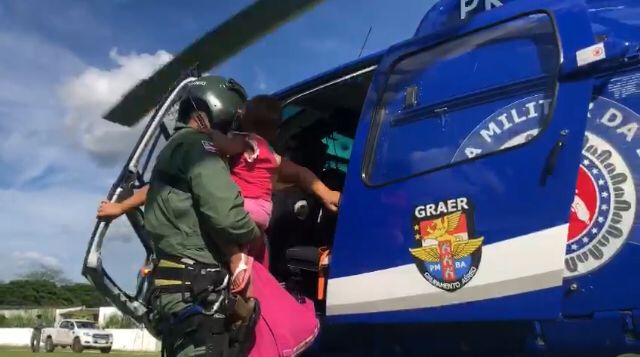 No momento em que as equipes do helicóptero Guardião 02 pousavam na aldeia Tupinambá para entregar lonas, moradores pediram ajuda aos policiais para socorrê-la.