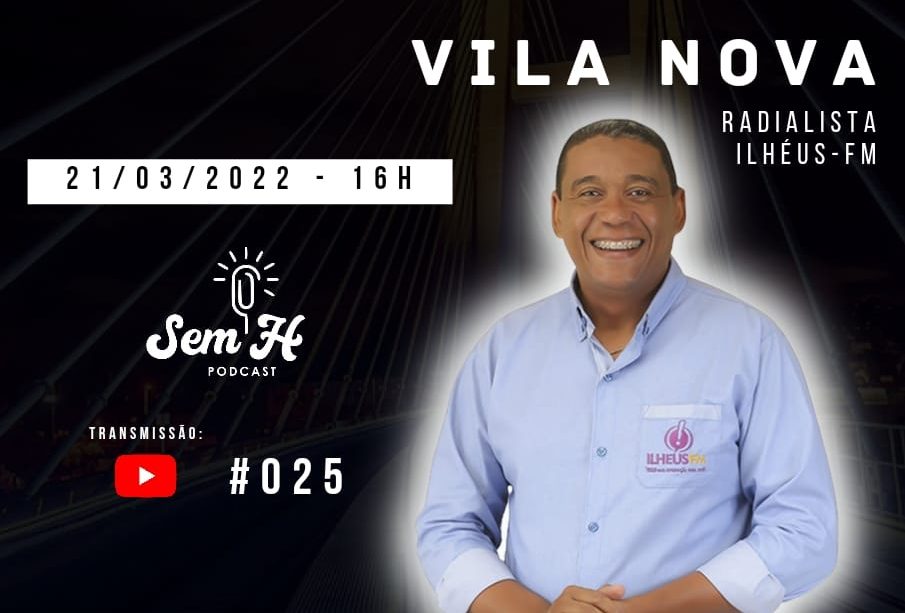 Na segunda-feira, dia 21 de março de 2022, às 16h, o Sem H Podcast recebe o radialista Vila Nova, apresentador do programa O Tabuleiro da Ilhéus FM. Na oportunidade, o comunicador vai contar um pouco da sua trajetória no rádio ilheense e como surgiu o seu programa que vai ao ar de segunda a sexta, das 7h às 9h, na 105.9.