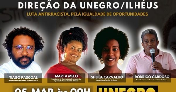 A Unegro/Ilhéus irá realizar o Ato de Posse de sua mais nova diretoria, e tem a honra de lhe convidar, a participar desse grande evento de reafirmação da Luta Antirracista em nosso município. Data: 05/03/2022 Horário: 09H Local: APPI/APLB SINDICATO