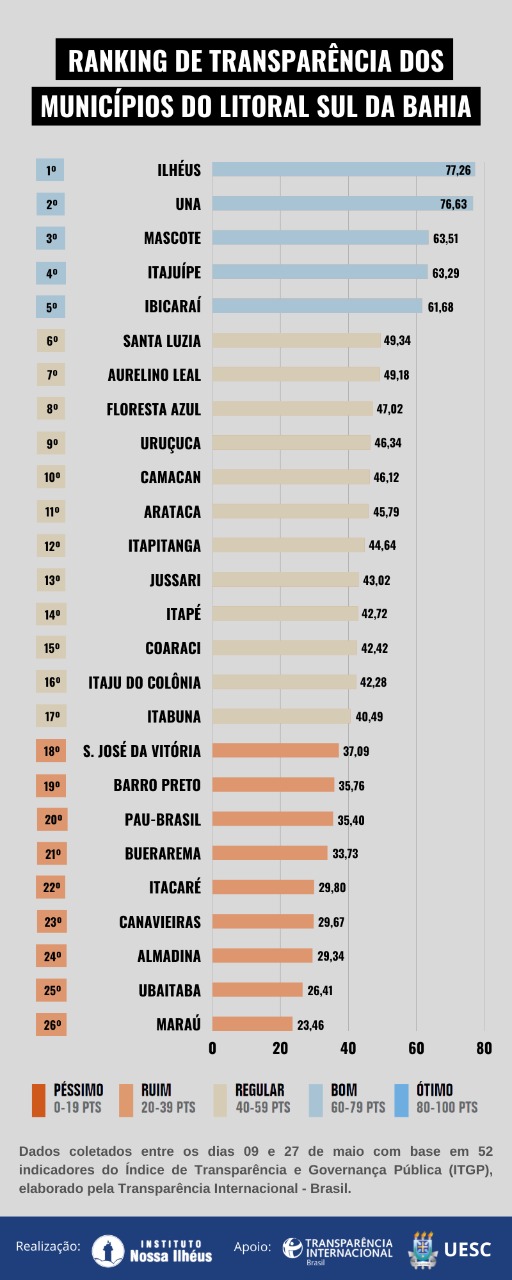 Nesta 1ª edição do Ranking, Ilhéus (77.2 pontos), Una (76.6 pontos) e se destacaram na liderança seguidas por Mascote (63.5 pontos), Itajuípe (63.2 pontos) e Ibicaraí (61.6 pontos). Dentre os 26 municípios avaliados, nenhum obteve nível “ótimo” e nove deles foram classificados com nível “ruim”. A escala do ranking vai de 0 a 100 pontos, na qual 0 (péssimo) significa que a prefeitura é avaliada como totalmente opaca e fechada à participação da sociedade e 100 (ótimo) indica que ela oferece alto grau de transparência e participação social.