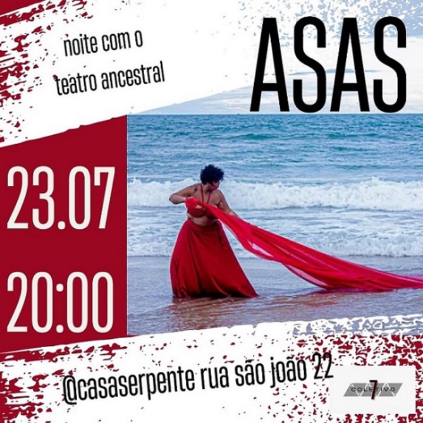 Nos ventos de Matamba Valdiná Guerra investiga as possibilidades performativas de nove círculos cem Asas. Uma vivência ancestral grafada pelo Coletivo 7. Na fala de Valdiná “Asas é um espetáculo-oferenda e é com ele que minha Mãe me move para poder adentrar nos mistérios do Axé. Sim. Estou captando recursos para minha iniciação como Yaó”.