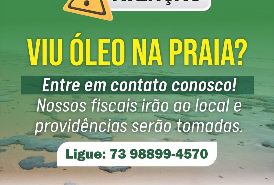 Viu óleo na praia? Entre em contato conosco – Ao identificar manchas de óleo, a Prefeitura recomenda que a população mantenha distância dos resíduos e entre em contato com a Sema, através do telefone (73) 98899-4570.