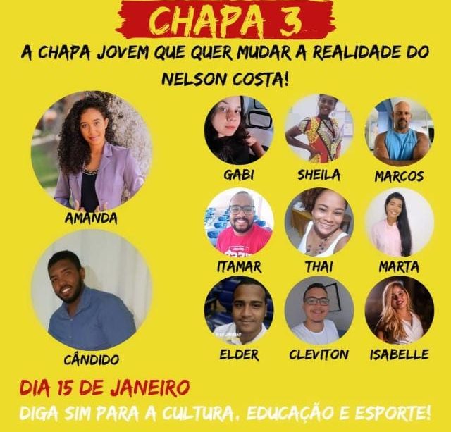 Com uma grande adesão dos moradores e composta por diversas lideranças jovens do bairro Nelson Costa, zona sul de Ilhéus, a Chapa 3 vem se destacando pela sua grande capacidade de agregar diversas gerações de pessoas.