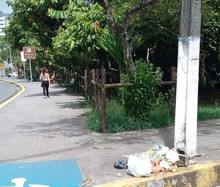 Na manhã desta quinta-feira (12), um morador de Ilhéus nos enviou fotos da Praça do Cacau, ponto turístico no bairro Cidade Nova, com sacos de lixo expostos nas calçadas do local.
