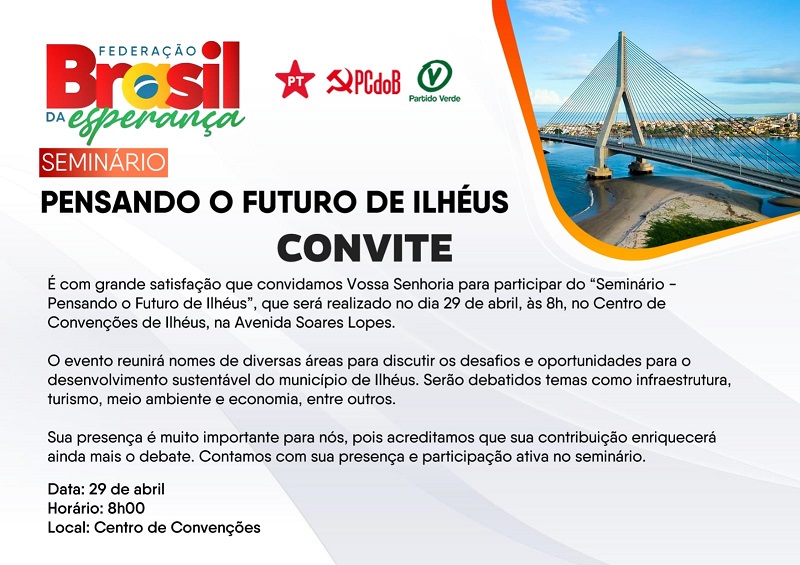 A Federação Brasil da Esperança, integrada pelos partidos dos Trabalhadores (PT), Comunista do Brasil (PCdoB) e Verde (PV), promove o seminário “PENSANDO O FUTURO DE ILHÉUS”, nesta sábado, dia 29 de abril, no Centro de Convenções, localizado na Avenida Soares Lopes, às 8h.