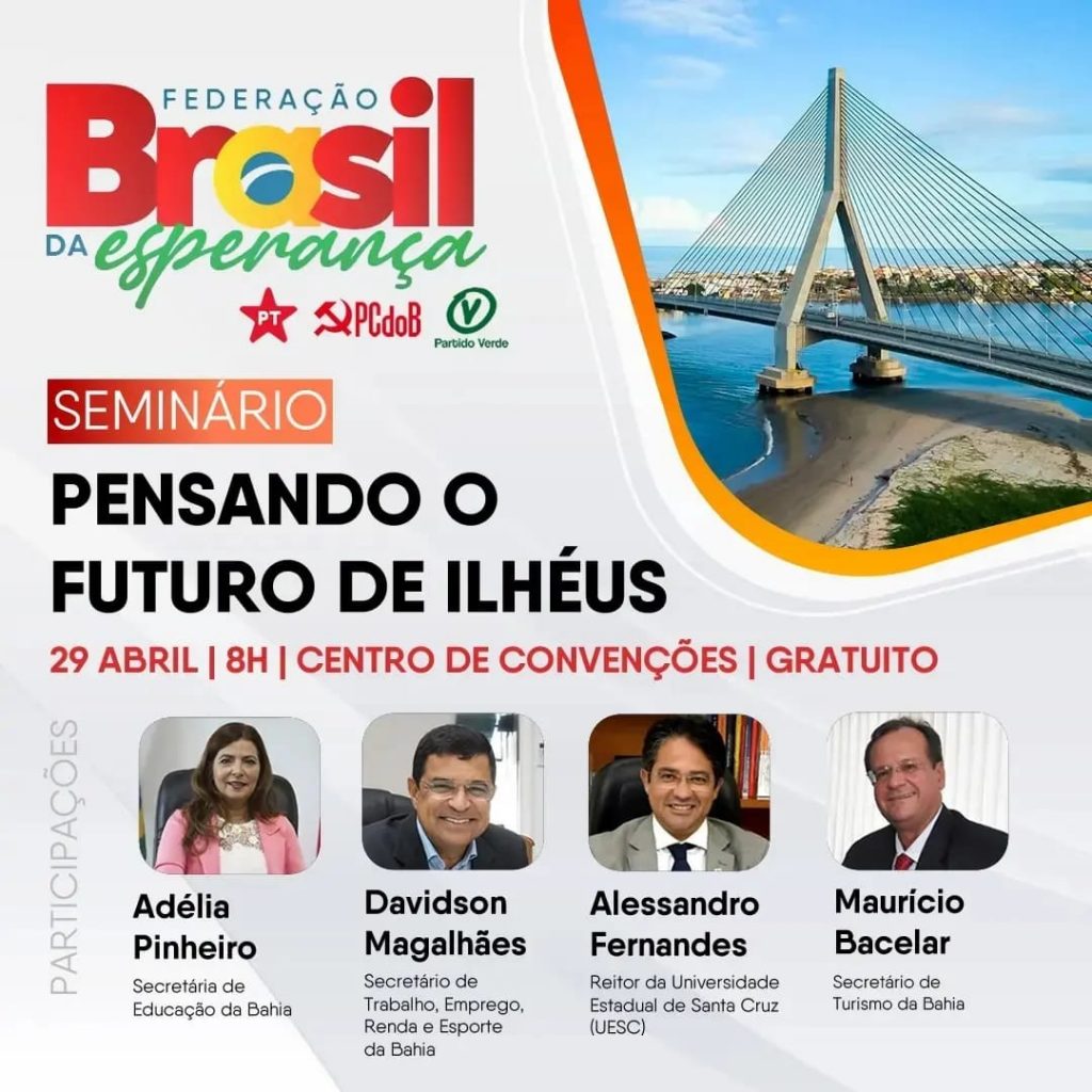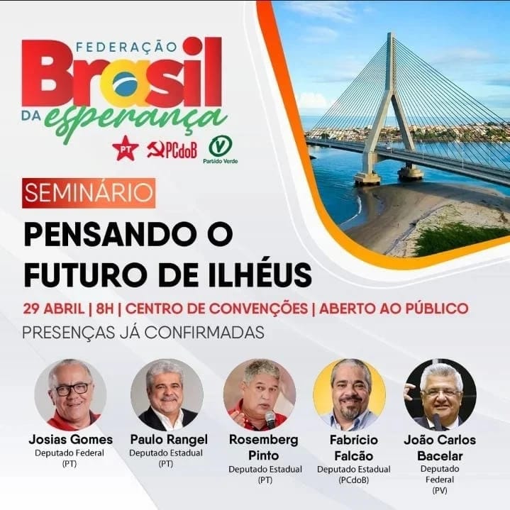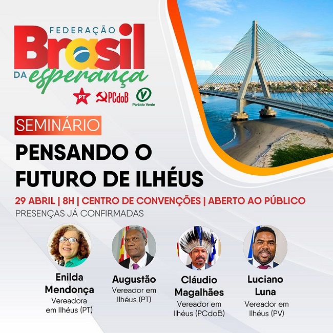 A Federação Brasil da Esperança, integrada pelos partidos dos Trabalhadores (PT), Comunista do Brasil (PCdoB) e Verde (PV), promove o seminário “PENSANDO O FUTURO DE ILHÉUS”, nesta sábado, dia 29 de abril, no Centro de Convenções, localizado na Avenida Soares Lopes, às 8h.