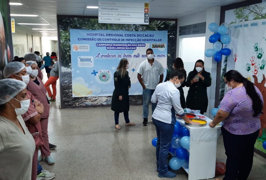 Uma árvore simbólica foi montada, em um painel, com as marcas de tinta das palmas das mãos de funcionários do Hospital Regional Costa do Cacau (HRCC), em Ilhéus, para celebrar o Dia Mundial da Higienização das Mãos, na última sexta-feira, dia 05 de maio.