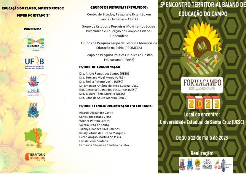 O Programa Formacampo vai realizar na Universidade Estadual de Santa Cruz (UESC), em Ilhéus-Ba, no período de 10 a 12 de maio de 2023, a abertura das atividades pedagógicas para este ano. É o 5º Encontro Territorial Baiano De Educação Do Campo.