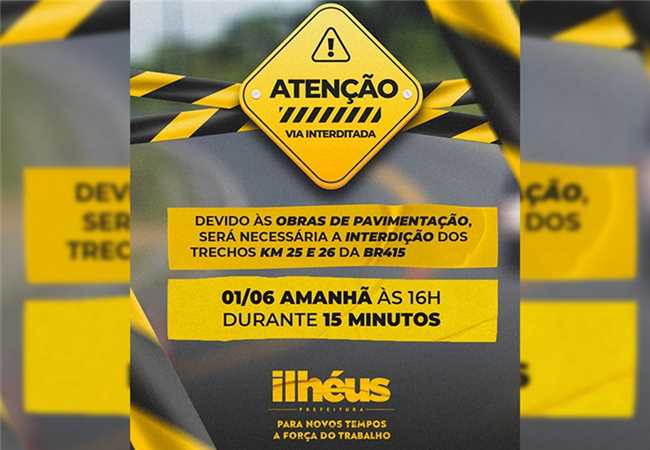 O Consórcio SVC/PAVISERVICE informa que o trânsito na BR-415 será interditado às 16 horas desta quinta-feira (1º), no trecho entre os quilômetros 25 e 26. A interdição é necessária para execução do desmonte de rocha, por meio de detonação controlada na estaca 340 da BA-649, em atendimento às normas e aos protocolos de segurança.