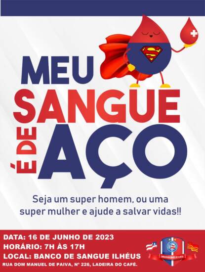 A Embaixada do Esporte Clube Bahia, em Ilhéus, convidando o torcedores do time para participar de sua campanha de doação de sangue, com o lema “Seja um super homem, ou uma super mulher e ajude a salvar vidas.