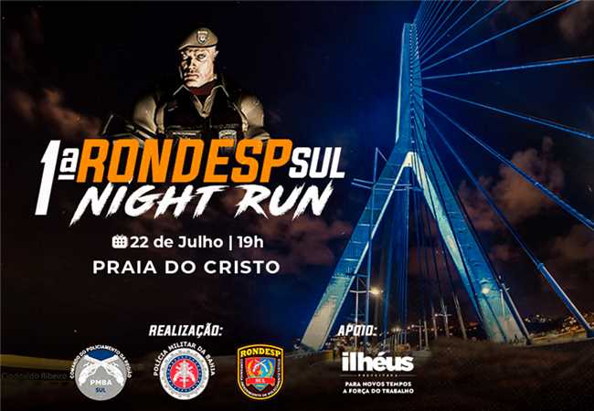Em comemoração aos 10 anos de implantação das Rondas Especiais do Sul da Bahia, a companhia realiza no dia 22 de julho, a partir das 19h, a 1ª Rondesp Sul Night Run, evento que conta com apoio da Prefeitura de Ilhéus e visa promover a prática esportiva e a integração entre polícia e comunidade. As inscrições podem ser feitas pela plataforma Races. Clique aqui.