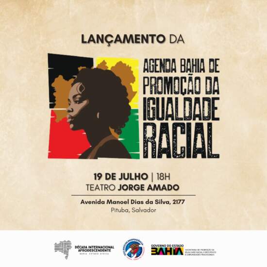 O Governo do Estado, por meio da Secretaria de Promoção da Igualdade Racial e dos Povos e Comunidades Tradicionais (Sepromi), convida para o Lançamento da Agenda Bahia de Promoção da Igualdade Racial.