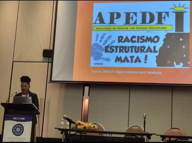 The Association of People with Sickle Cell Disease (APEDFI) and black women with sickle cell disease (SCD) in Ilhéus-BA (Brazil): oppressions, mobilization and achievements (A Associação de Pessoas com Doença Falciforme de Ilhéus [APEDFI] e mulheres negras com doença falciforme em Ilhéus-Ba, Brasil: opressões, mobilização e conquistas) foi o tema do paper cientifico apresentado pela professora e pesquisadora do Departamento de Filosofia e Ciências Humanas(DFCH) da Universidade Estadual de Santa Cruz (Uesc) Flávia Alessandra de Souza, no XX ISA World Congress of Sociology of the International Sociological Association (XX Congresso Mundial de Sociologia da Associação Internacional de Sociologia),