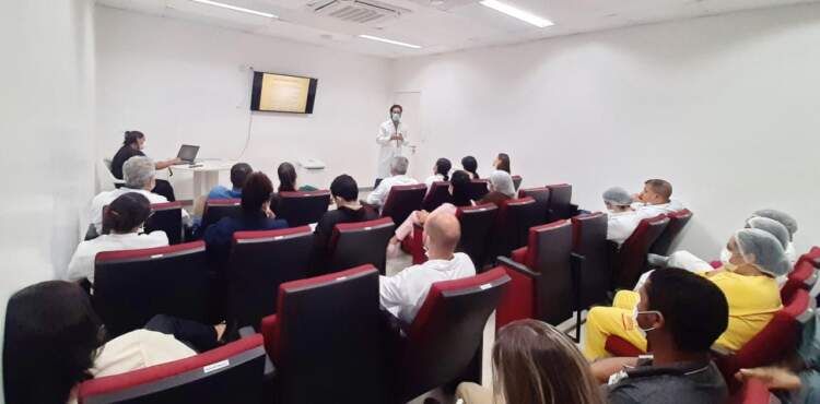 Após a exposição do médico, a enfermeira Ana Paula Lavigne, integrante do SCIH, abordou o tema biossegurança. Ela repassou orientações sobre prevenção de acidentes de trabalho com material perfurocortante e exposição de risco a material biológico, também reforçou a importância sobre o uso dos Equipamentos de Proteção Individual (EPIs) adequados nas atividades laborais no hospital.
