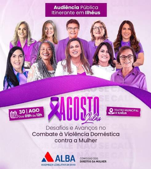Como encerramento da programação do mês dedicado ao combate à violência contra a mulher, a Comissão dos Direitos da Mulher da Assembleia Legislativa da Bahia (ALBA), em parceria com a Prefeitura de Ilhéus, realiza a Audiência Pública Itinerante com o tema “Agosto Lilás: Desafios e Avanços no Combate à Violência Doméstica contra a Mulher”. O encontro acontece nesta quarta-feira (30), no Teatro Municipal, às 9h.