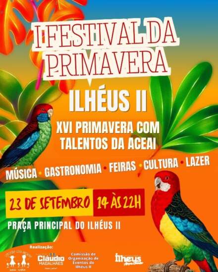 Alô, Ilhéus II, está chegando o evento mais aguardado do ano na comunidade de Ilhéus II: o I Festival da Primavera e XVI Primavera com Talentos! Organizado pela Associação Centro Educacional De Ação Integrada – (ACEAI) em parceria com o Vereador Cláudio Magalhães e a Comissão de Organização de Eventos, com o apoio fundamental da Prefeitura Municipal de Ilhéus.