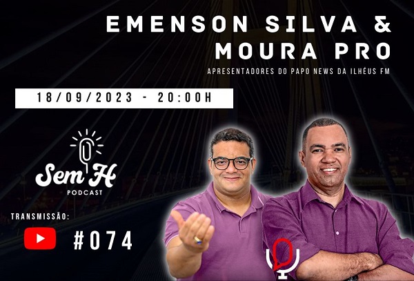 Nesta segunda-feira (18), às 20h, ao vivo pelo canal do Sem H Podcast, teremos Abmael Moura Santos, também conhecido como Moura Pro, e Emenson Silva, apresentadores do programa Papo News da Ilhéus FM.