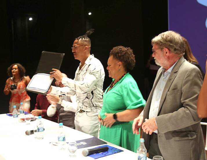 A sequência de discursos contemplou as falas do representante dos funcionários terceirizados da UFSB, Jorge Raimundo dos Santos; do representante discente no Consuni, Felipe Soares de Moraes; da coordenadora de Culturas Populares e Relações Comunitárias, e representante dos técnicos administrativos em Educação, Ize Duque Magno; e do decano do Instituto de Humanidades, Artes e Ciências do Campus Sosígenes Costa, e relator da proposta da honraria no Consuni, professor Francisco de Assis Nascimento Júnior.