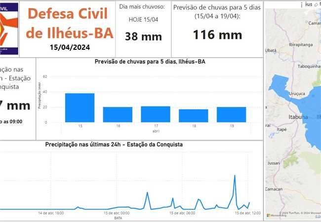 A Defesa Civil de Ilhéus alerta a população sobre a possibilidade de chuva intensa para a nossa região. A previsão é de que chova até 116 milímetros até o dia 19 de abril, de acordo com o INMET (Instituto Nacional de Meteorologia) e o CEMADEN (Centro Nacional de Monitoramento e Alertas de Desastres Naturais).