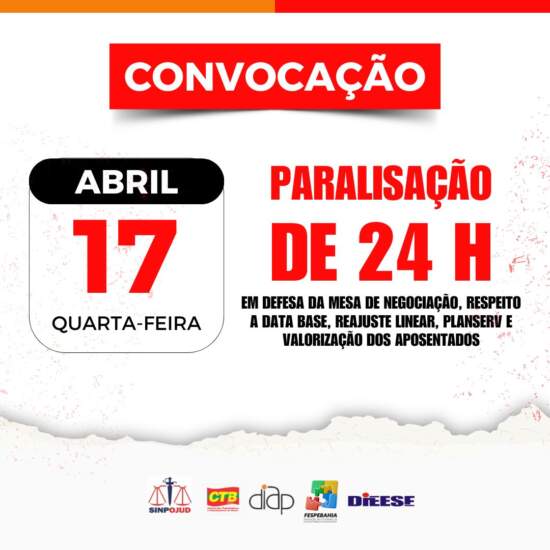 Na próxima quarta-feira (17), às 7 horas da manhã, o Sinpojud, ao lado de outras entidades sindicais, como a FESPEBAHIA, Sindsaúde Bahia, APLB e Sindsefaz, estará concentrado em frente ao Shopping da Bahia para um grande ato público e uma carreata em direção ao Centro Administrativo da Bahia (CAB). Para tanto, estão sendo convocados os servidores do judiciário para reforçarem o movimento, pois é importante que todos lutem juntos.