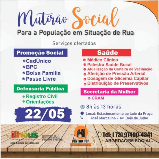 A Prefeitura de Ilhéus, por meio da Secretaria de Promoção Social e Combate à Pobreza, realiza, nesta quarta-feira (22), o 5º Mutirão Social e esta edição será voltada para a população em situação de rua. O evento acontece na Avenida 2 de Julho, no estacionamento ao lado da Praça José Marcelino, das 8 às 13 horas.